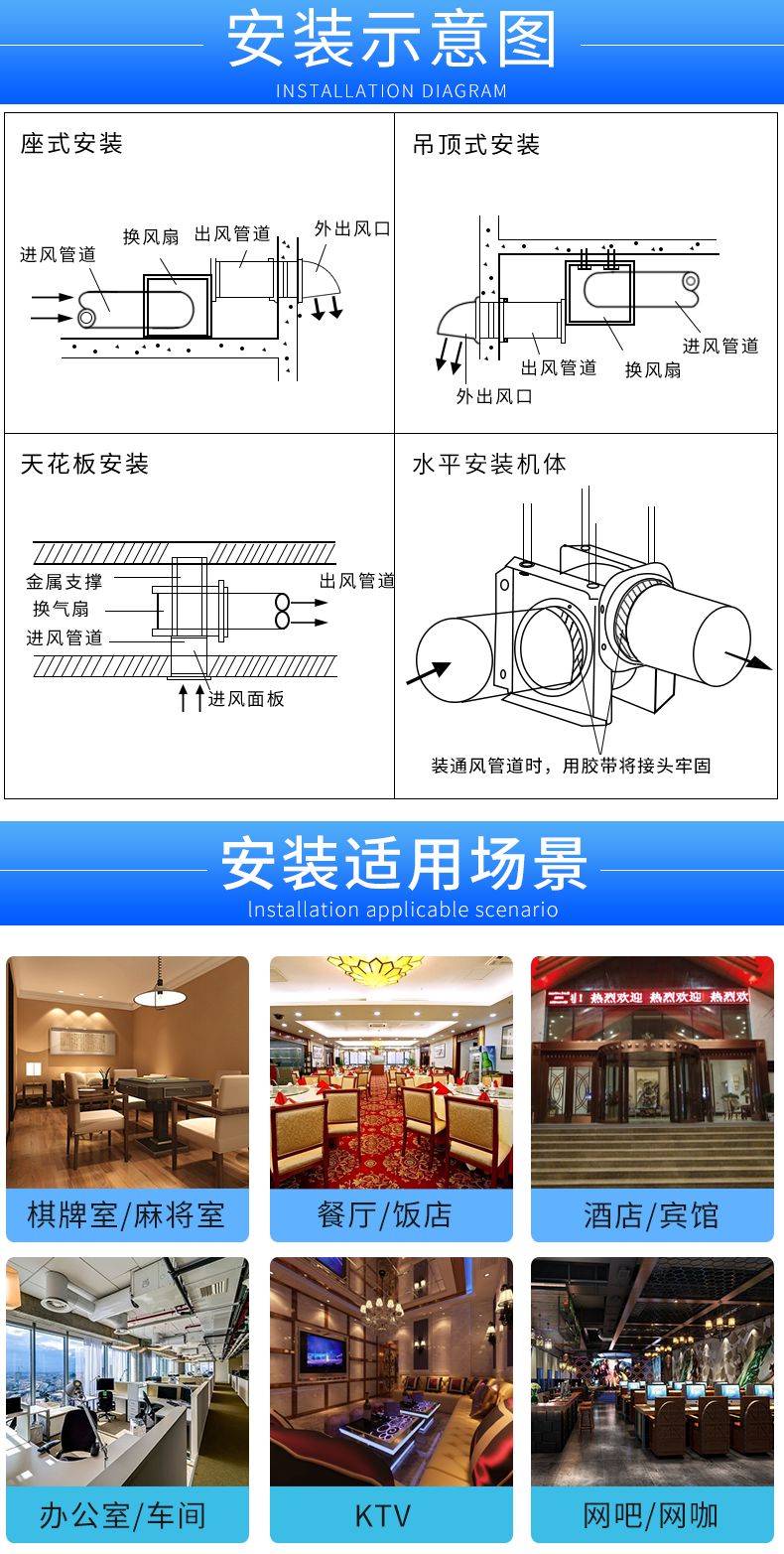 3、分体式管道风机是需要安装在天花板当中的,进风口和出风口,都会和通风器连接在一起,进行换气的时候,噪音比较小,稳定性能高。