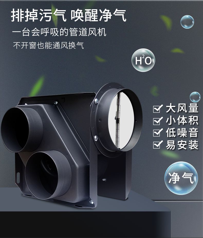 1、分体(一拖二)管道风机 ,该风机采用双进一出集合两个进风口与一个出风口于一身的设计。