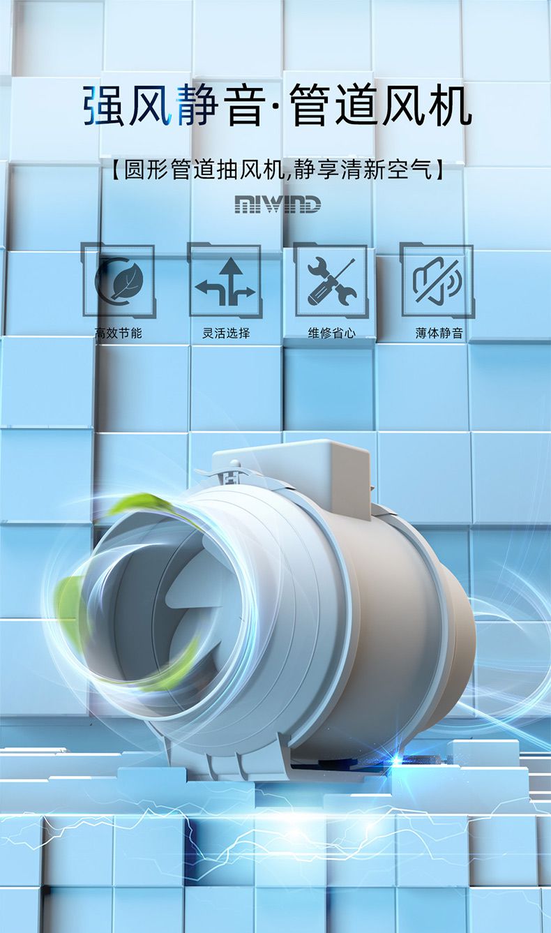 1、斜流管道风机采用ABS塑料一次性灌注而成的扭曲翼形叶片,高速运转时将流体力学发挥到顶,因此能效比非常高,可以达到70%。