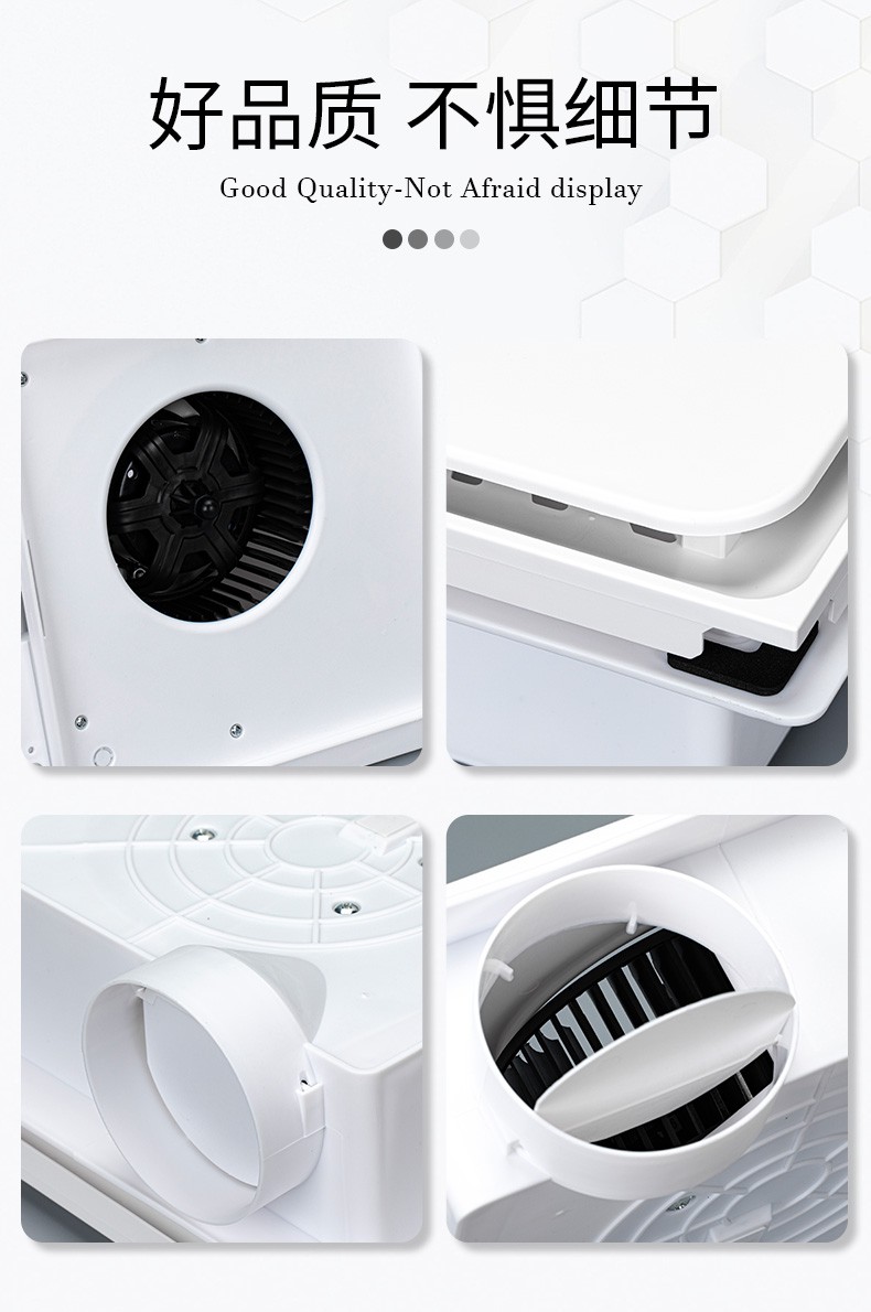 2、搭配纯铜芯滚珠轴承高速电机,轴向风轮,阿基米德螺旋风道,防止贯流止回阀设计,防虫防蚊。