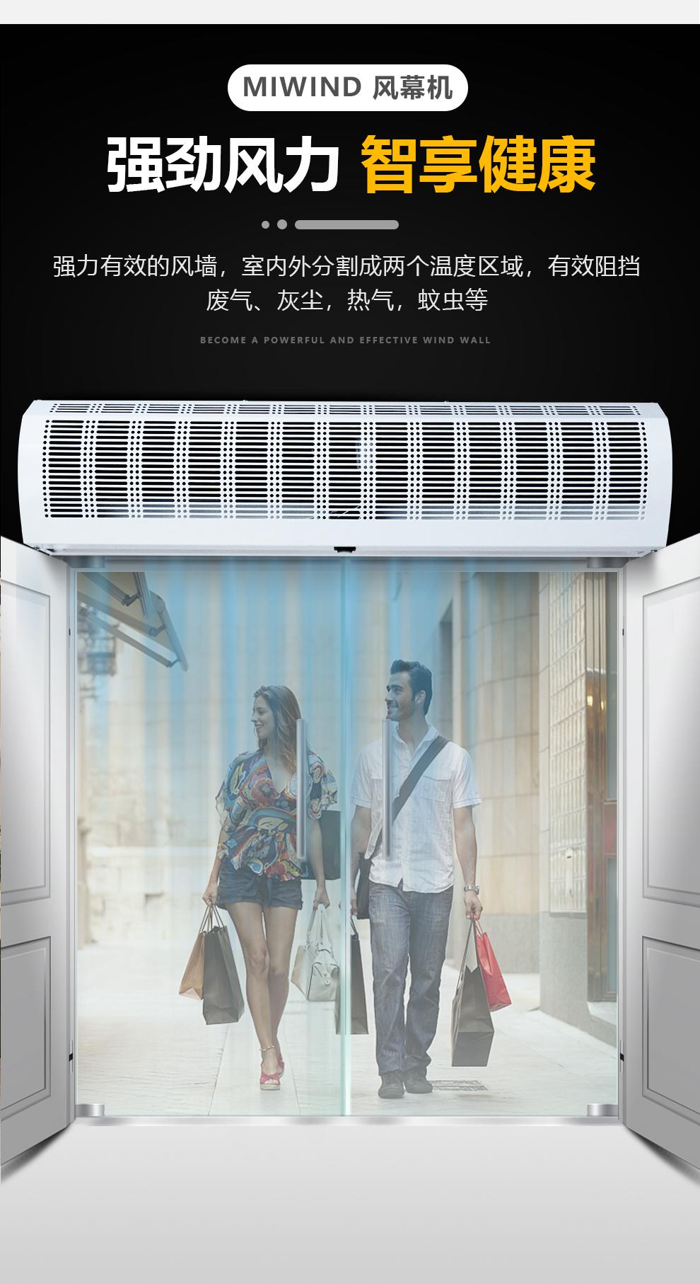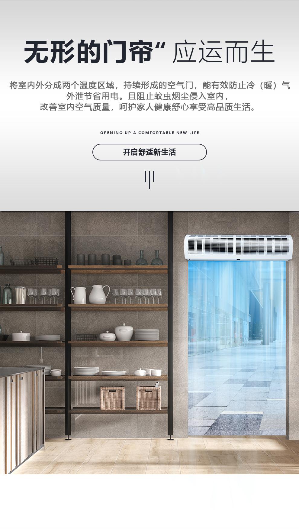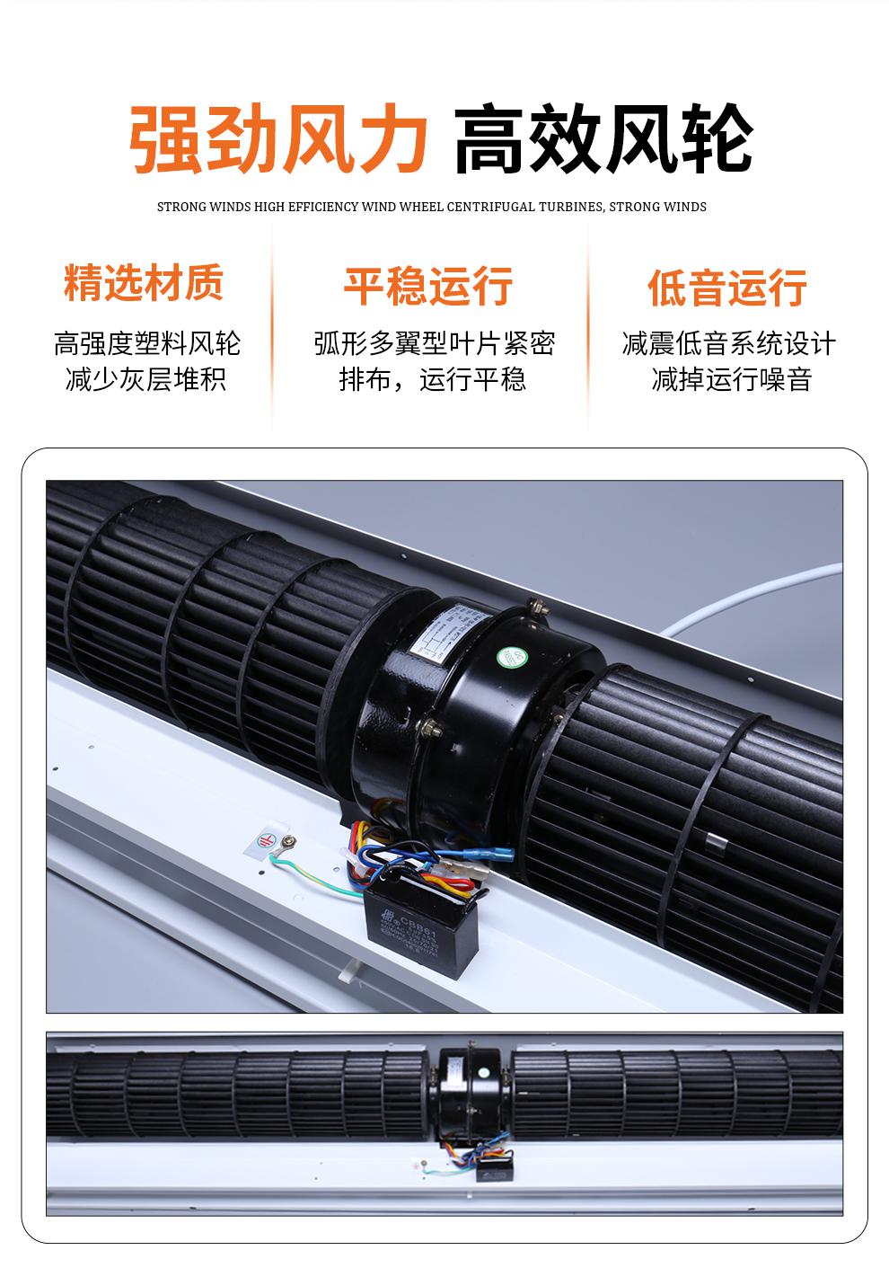 2、贯流式空气幕(风幕机)是采用单相电容运行式电动机驱动,带动外型匀称的ABS塑料风轮产生分布均匀的幕式气流。