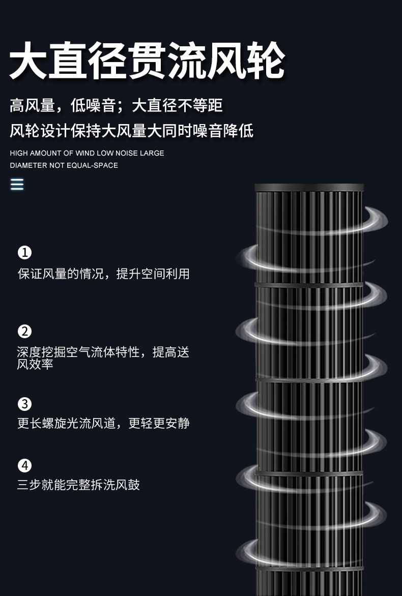 2、不等距贯流风轮,降低噪音,可调节导风条设计,降低噪音,风力强劲,运行平稳。