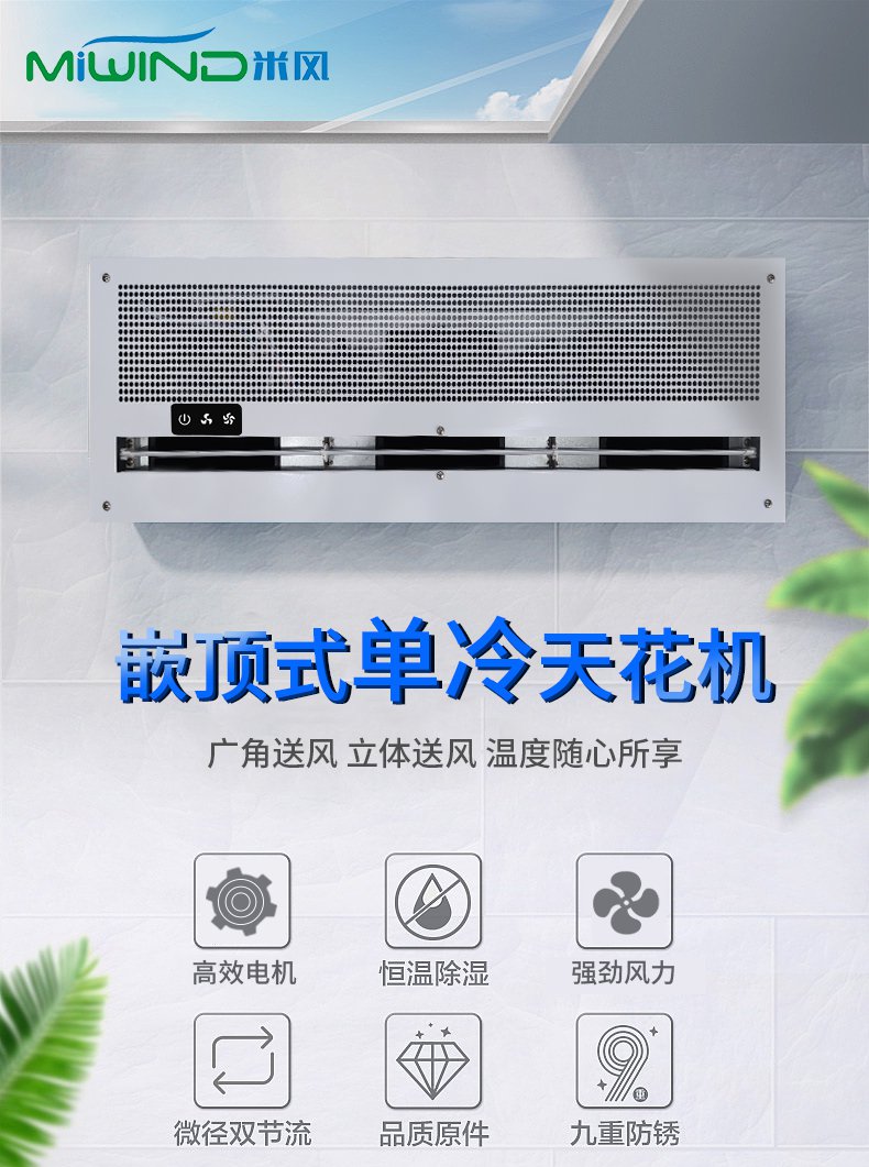 1、嵌入吸顶式天花风幕机适用于无法侧装高档玻璃门侧面无足够进风空间等特殊环境。