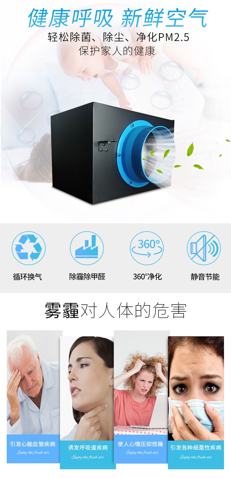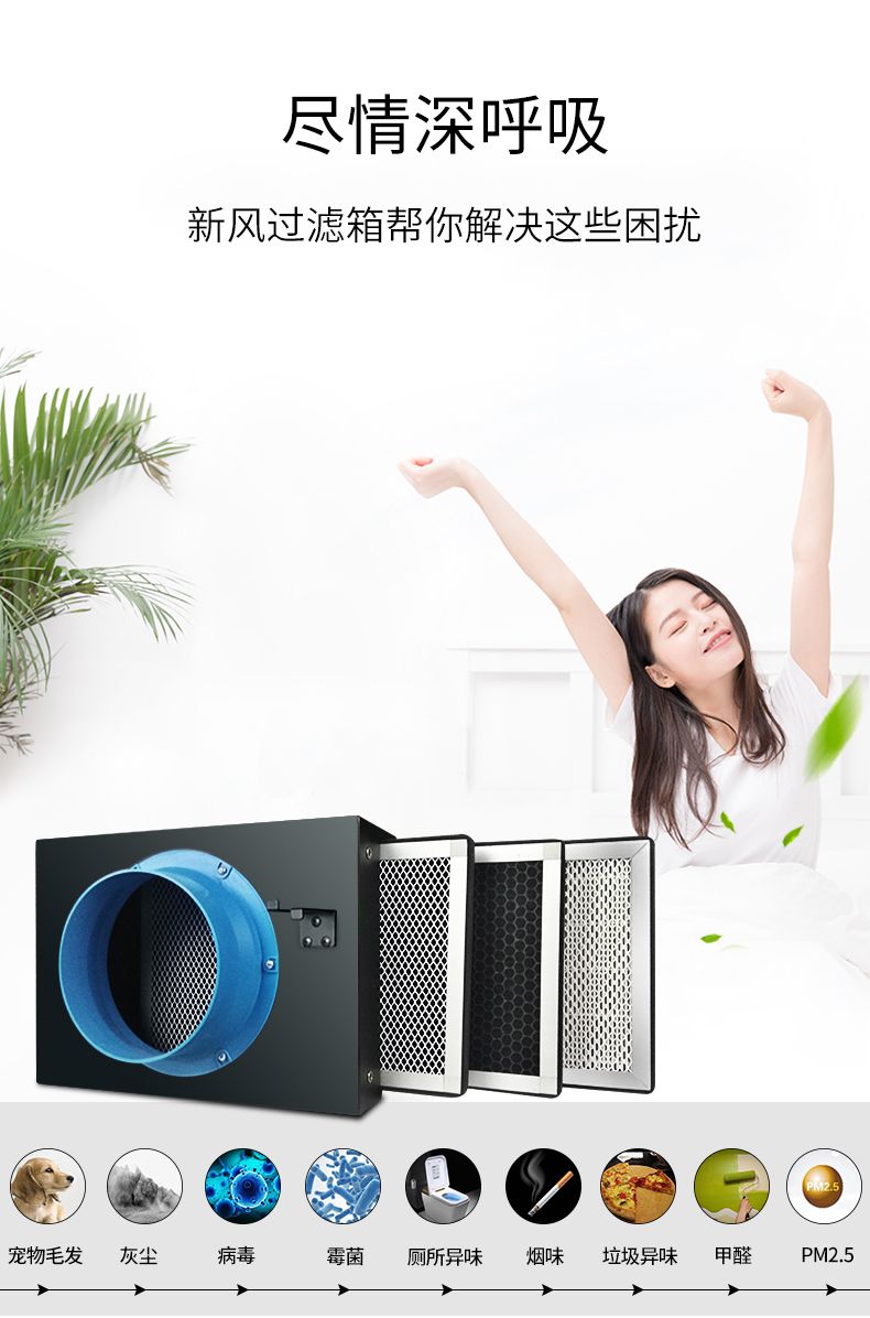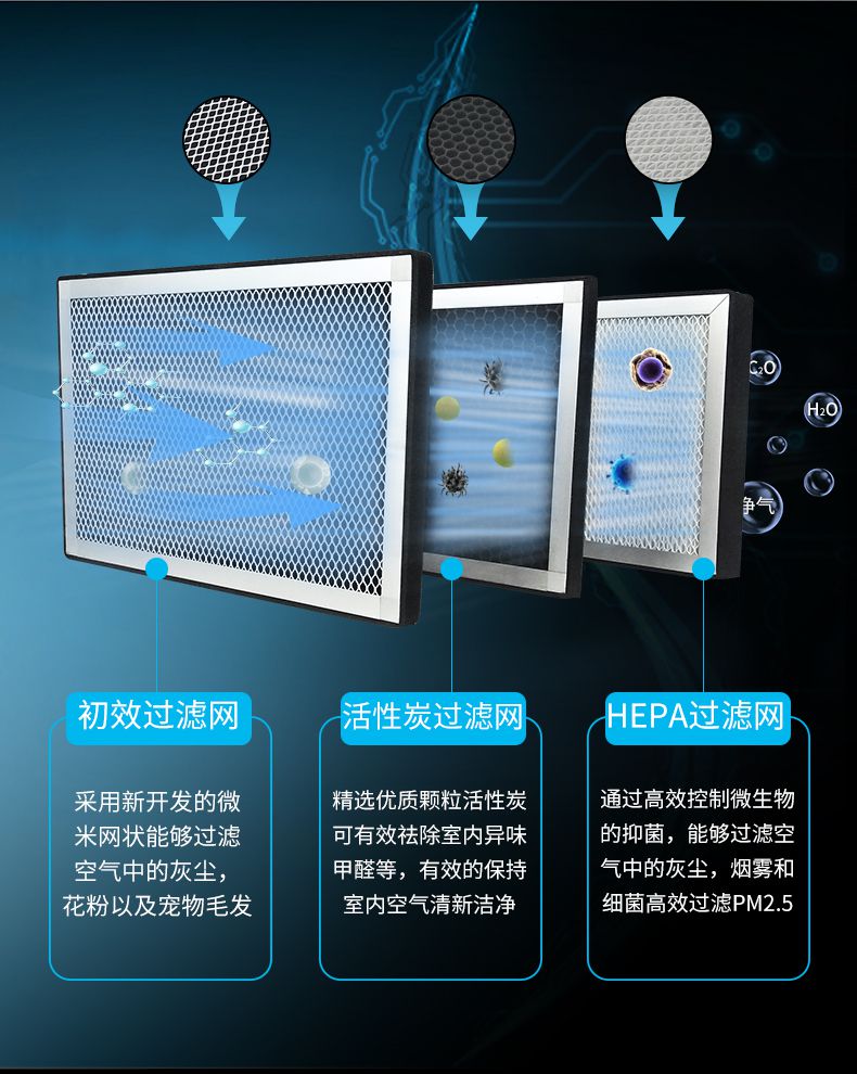 第三层:HEPA网过滤,可过滤PM2.5等微型颗粒物; 采用多层折叠复合滤网,其内部细小微孔对颗粒物捕捉能力较强,长效净化、大大降低风阻,增加新鲜空气输出量。